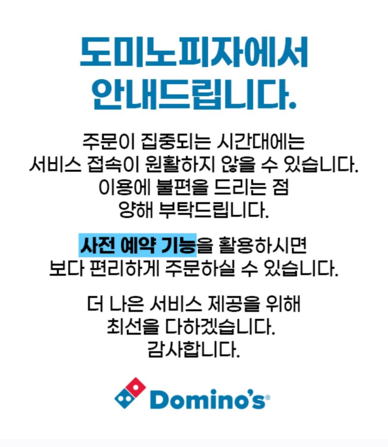 25일 도미노피자는 자사앱에 "주문이 집중되는 시간대에는 서비스 접속이 원활하지 않을 수 있다"며 "사전 예약 기능을 활용하면 보다 편리하게 주문할 수 있다"는 내용의 공지문을 게시했다.