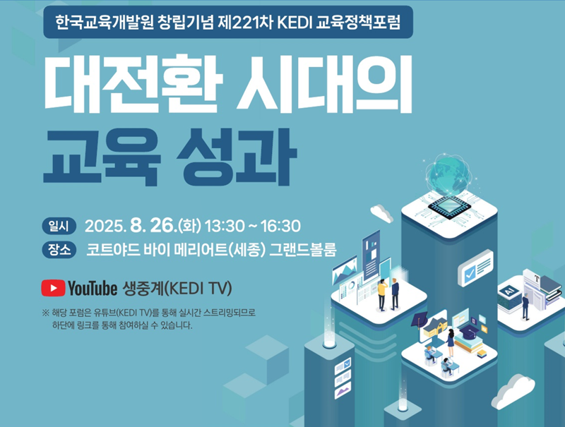 [파이낸셜뉴스] 한국교육개발원이 창립 53주년을 맞아 26일 코트야드 메리어트 세종 그랜드볼룸에서 '대전환 시대의 교육 성과'를 주제로 제221차 KEDI 교육정책포럼을 개최한다.
