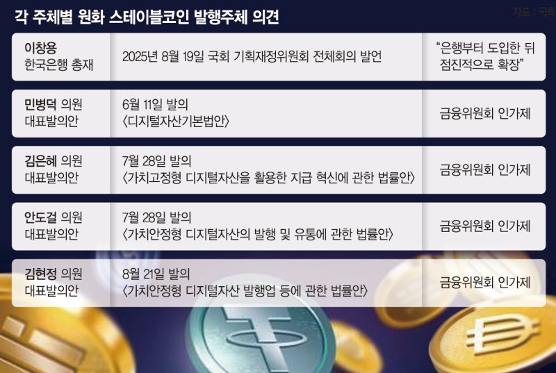 국회 역시 핀테크 기업 입장에 무게를 실어주고 있다. 현재 국회에 발의된 스테이블코인 관련 입법안 4개 모두 '인가제'를 택하고 있다. 금융위원회의 심사를 거쳐 인가를 받은 사업자에 한해 발행이 가능한 게 골자다. 스테이블코인 법안을 대표발의한 안도걸 더불어민주당 의원도 "스테이블코인은 시장의 시스템에 의해 발행·유통되는 통화"라고 밝힌 바 있다.