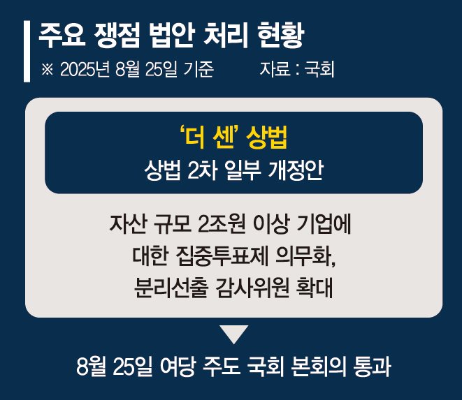 앞서 지난 7월 3일 이사의 충실의무를 회사에서 주주까지 확대, 독립이사 도입 등의 내용을 담은 상법 개정안이 먼저 통과됐고, 이날 처리된 2차 상법개정안은 자산 2조원 이상 상장사에 대해 집중투표제 도입을 의무화하고 감사위원 분리 선출을 기존 1명에서 2명 이상으로 확대하는 내용이 핵심이다.