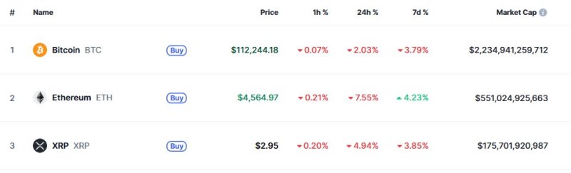 26일 새벽 4시 10분 현재 글로벌 코인 시황 중계사이트인 코인마켓캡에서 비트코인은 24시간 전보다 2.03% 하락한 11만2244달러를 기록하고 있다. 한때 비트코인은 11만2000달러가 붕괴하기도 했다.