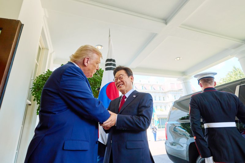 [워싱턴=뉴시스] 고범준 기자 = 이재명 대통령과 도널드 트럼프 미국 대통령이 25일(현지 시간) 미국 워싱턴DC 백악관에서 한미 정상회담에 앞서 인사를 나누고 있다. (공동취재) 2025.08.26. bjko@newsis.com <저작권자ⓒ 공감언론 뉴시스통신사. 무단전재-재배포 금지.>