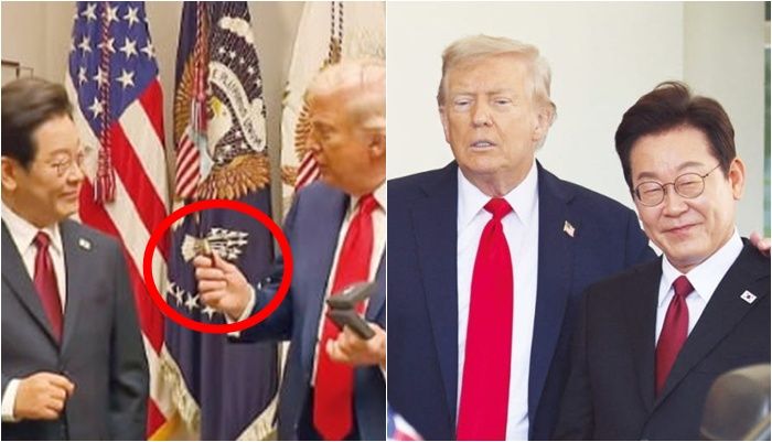 트럼프 대통령은 "어디서 만든 것이냐" "도로 가져갈 거냐"고 되물었고, 이 대통령은 "한국 것"이라고 답하며 가져가도 좋다는 의미의 제스처를 취했다.
