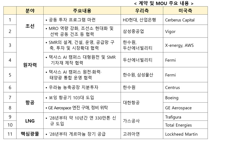 라운드테이블 직후에는 조선, 원자력, 항공, 액화천연가스(LNG), 핵심광물 분야에서 총 11건의 계약·MOU가 체결됐다.