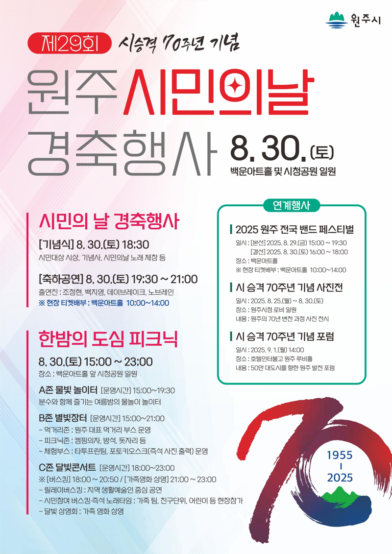 【파이낸셜뉴스 원주=김기섭 기자】원주시는 시 승격 70주년을 기념해 오는 30일 백운아트홀과 시청공원 일원에서 제29회 원주시민의 날 경축행사를 개최한다.
