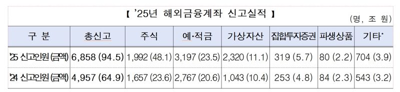 26일 국세청에 따르면 올해(2025년) 해외금융계좌 신고자는 총 6858명으로 전년 대비 1901명(38.3%) 증가했다. 신고금액은 94조5000억원으로 29조6000억원(45.6%) 늘었다.