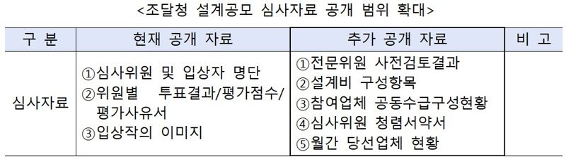 조달청은 아울러 ‘심사 과정의 자료공개 범위를 확대’해 설계공모 과정의 이해를 돕고 투명하고 공정한 경쟁 환경을 제공한다. 심사자료 공개는 현재 '건축 설계공모 운영지침(국토교통부)'및 '조달청 운영기준'에 따라 일부 공개 중이나 업계의 건의를 수용해 심사 공정성에 영향을 미치지 않는 범위 안에서 나라장터에 추가 공개해 불공정 논란을 최소화할 예정이다.