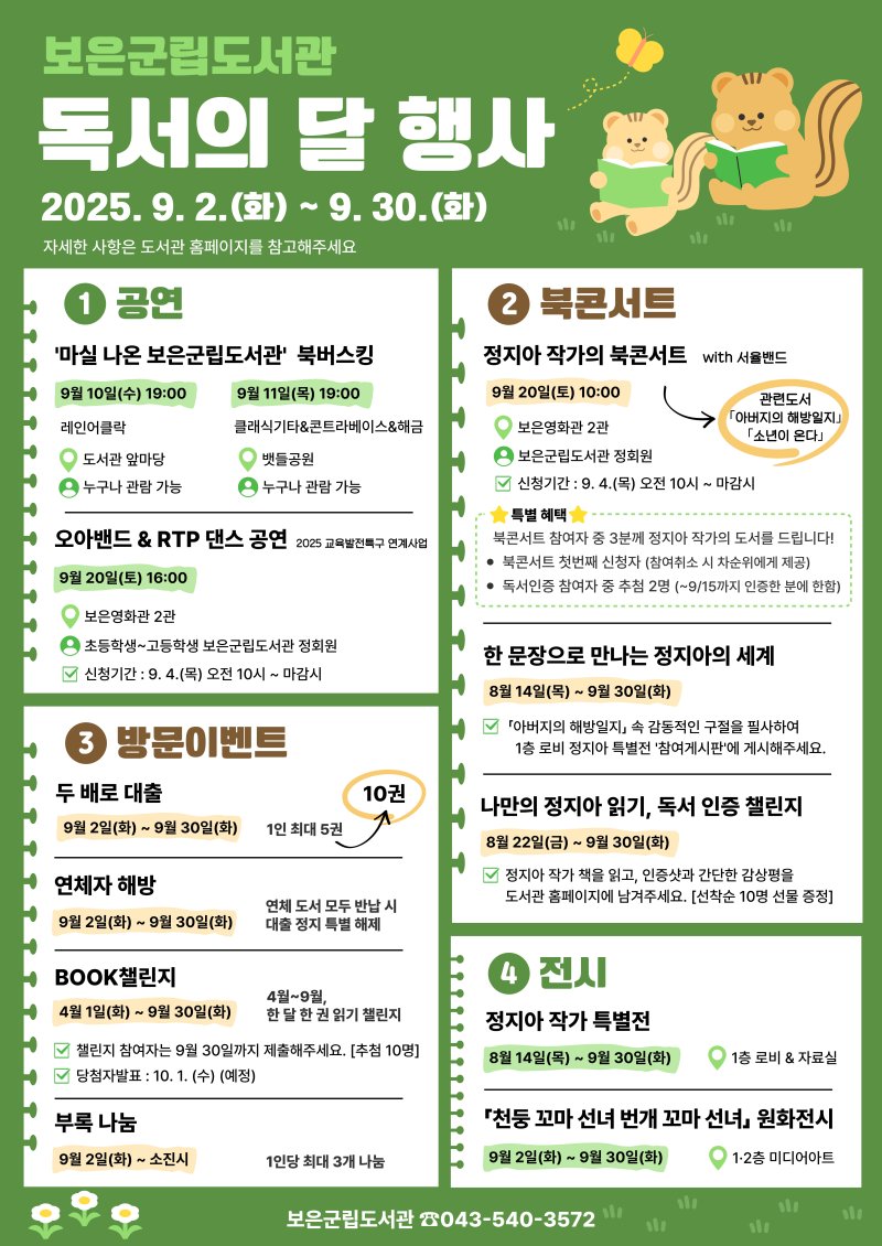 첫 행사로 9월 10일 오후 7시 도서관 앞마당에서 '마실나온 보은군립도서관' 북버스킹과 인디밴드 '레인어클락'이 감성 공연을 선보인다.