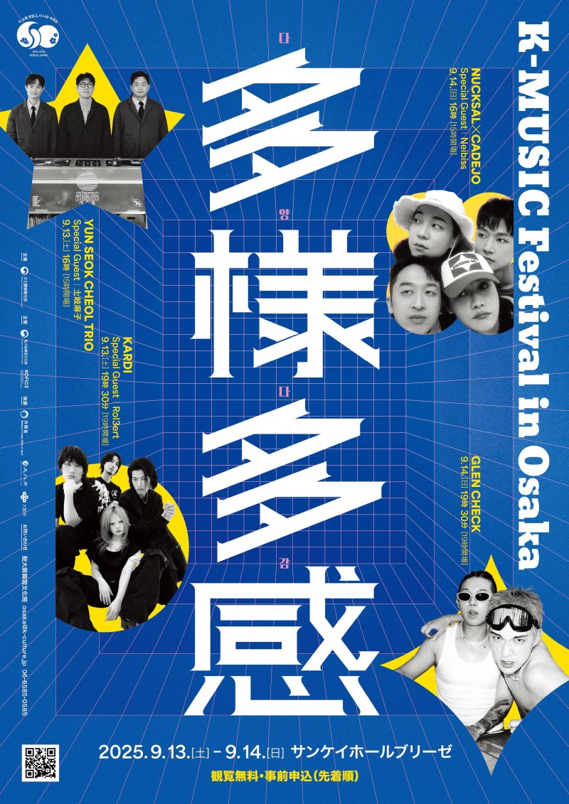 [서울=뉴시스] 최희정 기자 = 주오사카한국문화원은 한일 국교정상화 60주년 및 2025~2026 한일중 문화교류의 해를 기념해 다음 달 13~14일 일본 오사카 산케이홀 브리제에서 한국의 다양한 대중음악을 선보이는 '케이-뮤직 페스티벌 인 오사카 : 다양다감(K-Music Festival in Osaka : 多樣多感)'을 개최한다.