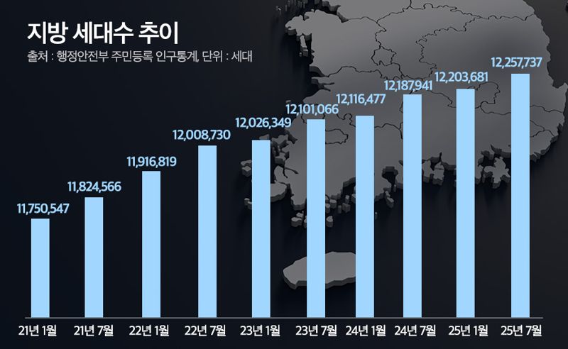 공급은 급감한 반면 수요는 꾸준히 증가하는 추세다. 행정안전부 주민등록 인구통계 자료에 따르면 지방(수도권 제외) 세대수는 2021년 1월 1175만547가구에서 올해 7월 기준 1225만7737가구로 4년 반 만에 50만 가구 이상 증가한 것이다.