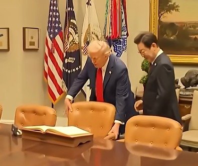 트럼프 대통령은 이날 한미 정상회담에 앞서 백악관에서 가진 서명식에서 이 대통령이 방명록 앞에 앉기 편하도록 직접 의자를 빼주는 매너를 보였다.