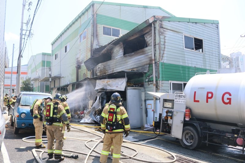 (부산=연합뉴스) 손형주 기자 = 26일 낮 12시 23분께 부산 사상구 학장동에 있는 히터 제조공장서 폭발로 추정되는 불이 났다.