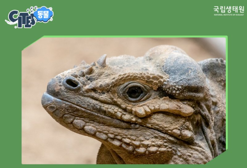 코뿔이구아나는 코에 난 뿔이 특징이다. 수컷의 주둥이에 난 뿔이 코뿔소를 닮아 코뿔이구아나라는 이름이 붙었다.