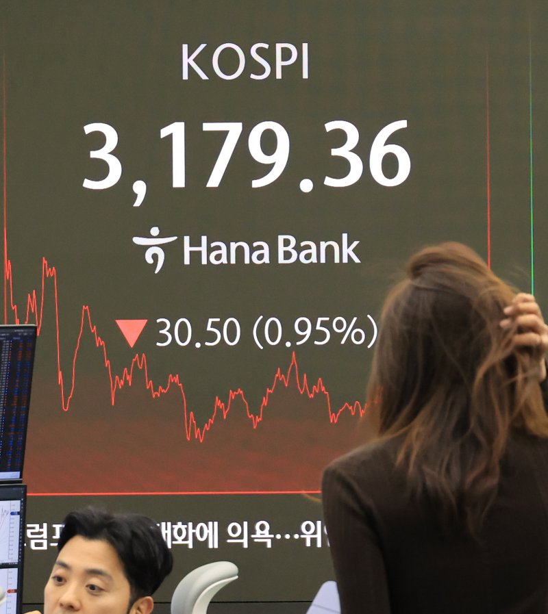 26일 한국거래소에 따르면 이날 코스피 지수는 전 거래일 대비 30.50p(0.95%) 하락한 3179.36에 거래를 마쳤다. 이날 지수는 전장 대비 0.31% 하락한 3199.92에 출발한 뒤 3170선까지 내려앉았다.