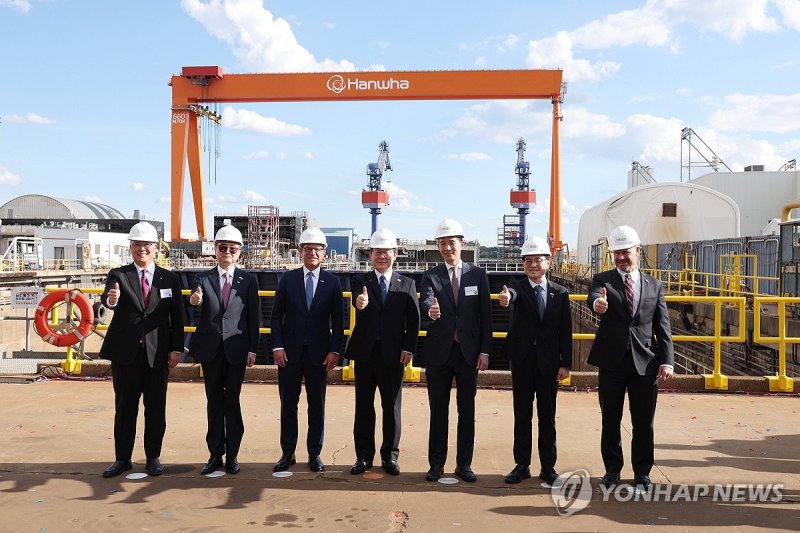 이 대통령은 이날 오후 4시께 미국 해양청이 발주한 국가안보 다목적 선박 '스테이트 오브 메인'호의 명명식에 참석한 뒤 흰색 안전모를 쓰고 김동관 한화그룹 부회장 등과 함께 현장을 둘러봤다.