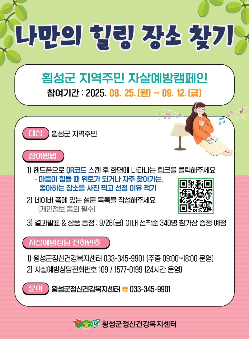참여 희망자는 포스터 또는 사회관계망서비스(SNS)·인스타그램에 게시된 QR코드를 통해 참여 하면 된다. 마음이 힘들거나 위로가 필요할 때 자주 찾아가는 장소의 사진을 찍고 선정이유를 제출하면 된다.