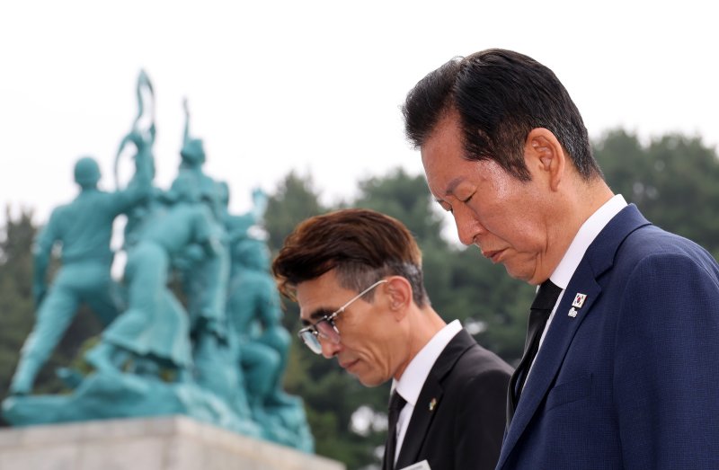 (서울=뉴스1) 김세정 임윤지 기자 = 정청래 더불어민주당 대표가 27일 국립대전현충원을 찾아 고 채 해병과 연평해전·천안함 피격 사건 전사자들의 묘역을 참배했다.