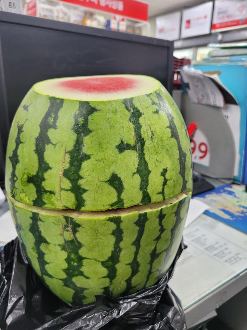 글 작성자인 A씨가 올린 사진에는 제사에 사용한 것으로 추정되는 수박 모습이 담겼다. 윗부분 일부는 잘려 나갔고 몸통도 반으로 토막 낸 상태였다.
