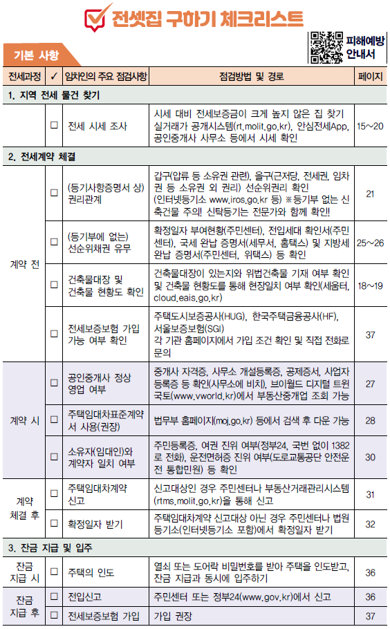 체크리스트는 안내서의 전세계약 과정별 필수 확인사항을 앞뒤 한 장으로 구성해 예비임차인이 휴대할 수 있도록 제작됐다. 상단에는 안내서를 다운로드 할 수 있는 QR코드도 포함하고 있다.