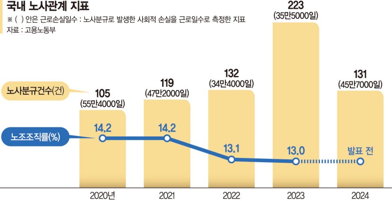 2020년부터 증가세를 보이면서 2023년 223건을 기록한 노사분규건수도 지난해 131건까지 반감했다.