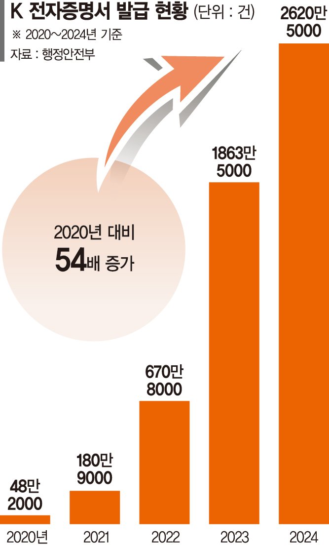 국민 생활 전반에서 디지털 전환이 가속화되면서 온라인 민원 이용률은 2020년 59.4%에서 2024년 83.7%로 24.3%p 증가했다. 디지털정부 서비스가 국민의 일상 속에 깊이 자리 잡았음을 보여준다. 특히 전자증명서 발급 건수도 2024년 약 2620만건으로 2020년 약 48만건에서 54배가 증가했고, 전년과 비교해서도 40.6%가 증가했다.