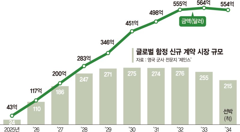 영국의 군사 전문지 제인스에 따르면, 향후 10년간 예상되는 글로벌 함정 신규 계약 시장 규모는 총 2100여 척으로, 그 금액만 약 3600억달러(약 503조원)에 이를 것으로 추정된다. 통합 HD현대중공업은 방산 분야에서 오는 2035년까지 연 매출 10조원 달성을 목표로 세웠다.