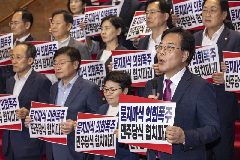 송언석 국민의힘 원내대표는 "우리는 국회를 일방적으로 폭주하는 민주당과 민주당 출신 국회의장의 일방적인 국회 운영에 강력히 반대하며 국회 운영에 일절 협조할 수 없음을 분명히 밝힌다"고 했다.