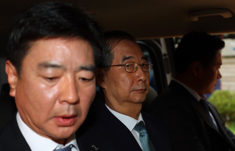윤석열 전 대통령의 내란 행위 방조 혐의를 받는 한덕수 전 국무총리가 27일 구속 전 피의자 심문(영장실질심사)을 마친 뒤 서울 서초구 서울중앙지법 청사를 나와 차량에 탑승해 있다. 사진=연합 지면화상
