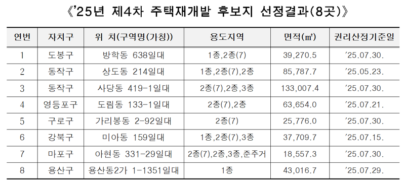 서울시는 지난 27일 2025년 제4차 주택재개발 후보지 선정위원회를 열고 8곳의 신통기획 후보지를 선정했다고 28일 밝혔다. 이로써 신통기획 재개발 추진구역은 총 130곳이 됐다.