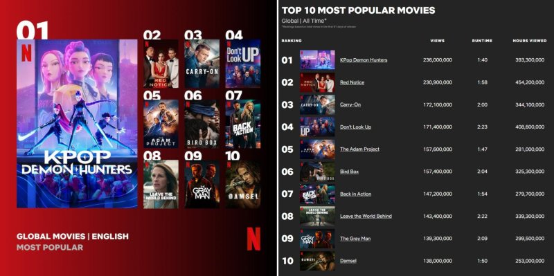 넷플릭스의 운영하는 투둠(Tudum)은 27일(현지시간) 케데헌이 지난주 2540만 뷰를 기록하며 공개 이후 총 2억 3600만 뷰를 달성해 역대 영어 영화 순위 1위를 차지했다고 밝혔다.