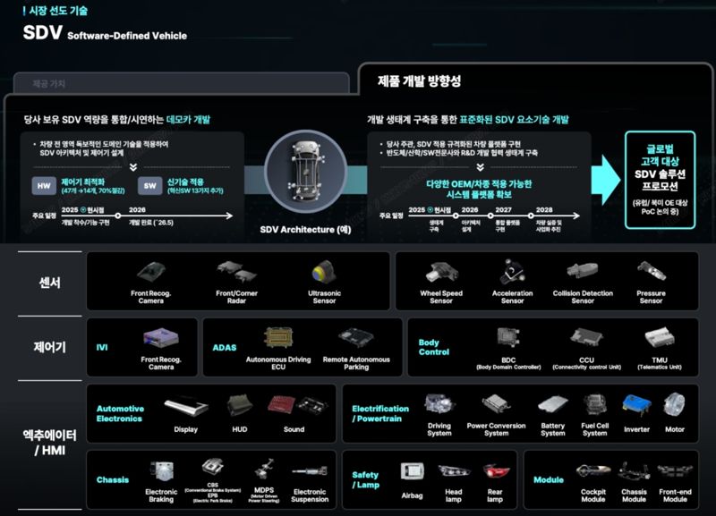 현대모비스는 지난 27일 오후 서울 여의도 페어몬트 호텔에서 '2025 CEO 인베스터 데이'를 열고 SDV 플랫폼 관련 2026년 5월 제어기 숫자를 47개에서 14개로 최적화하고, 13가지 소프트웨어 기술이 추가된 데모카 개발을 완료하겠다고 설명했다. 2027년에는 통합 플랫폼을 구현하고, 2028년에 차량 실증 및 사업화를 한다는 계획이다.