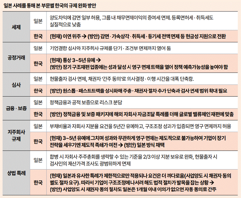 이에 일본의 산업재생법 취지를 반영해, 기업활력법(원샷법)을 실질 인센티브 중심으로 개편하는 것이 바람직하다는 진단이다. 단순한 절차 간소화를 넘어 세제 감면, 규제의 ‘영구적’ 유연화, 금융·보증 패키지, 현금성 인센티브를 포함한 ‘한국형 구조조정 패키지’가 필요하다고 제언했다.