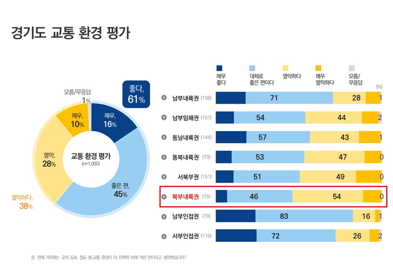 현재 교통환경에 대해서는 응답자의 61%가 '좋다'고 평가했으며, 최근 3년간 교통환경이 '좋아졌다'고 응답한 비율은 76%에 달했다.