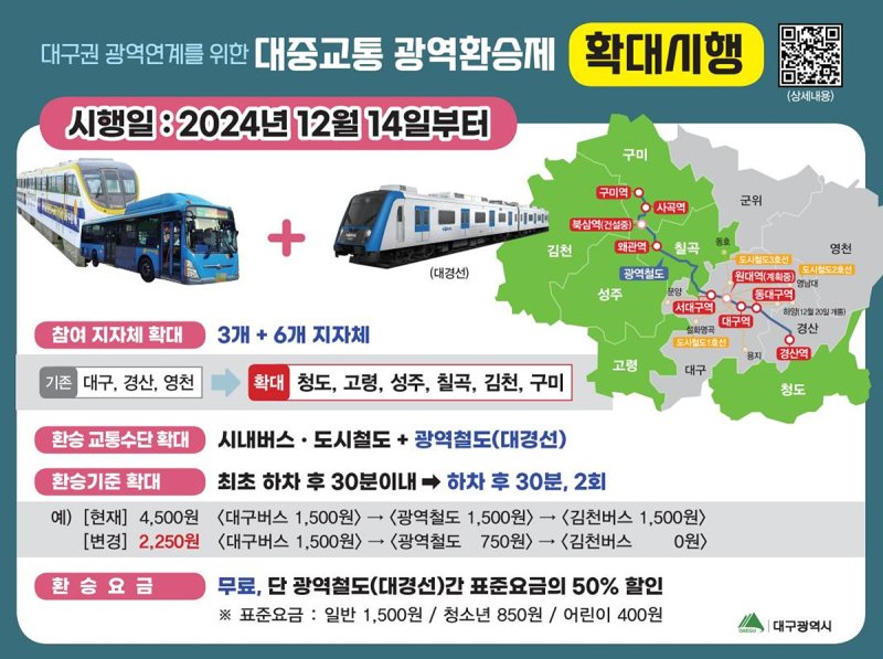 허준석 교통국장은 "광역환승제 확대 시행은 단순한 요금 할인 정책을 넘어 대구경북을 하나의 생활권으로 연결하는 중요한 정책이다"면서 "지역에 활력을 불어넣는 광역환승제는 정부의 '5극 3특 국가균형성장 전략'에도 부합, 대구경북의 공동 성장을 이끄는 데 기여할 것이다"라고 강조했다.