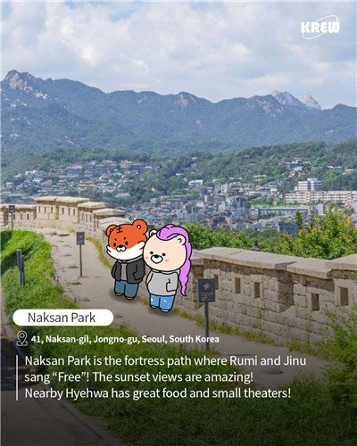 케데헌 주인공 진우와 루미가 함께 노래 '프리'(Free)를 부른 낙산공원을 외국인도 쉽게 정보를 찾을 수 있도록 한국관광통합플랫폼 비짓코리아(VISITKOREA)와 소셜미디어(SNS) 등을 통해 케데헌 주요 배경지로 소개한다.