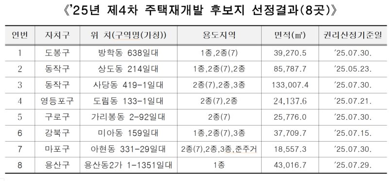 선정된 지역은 노후도가 높고 반지하 주택 다수 포함 지역 등 주거 환경 개선 필요성이 큰 곳들이다. 주민 참여 의지와 연접한 개발 사업과의 연계성 등이 고려됐다.