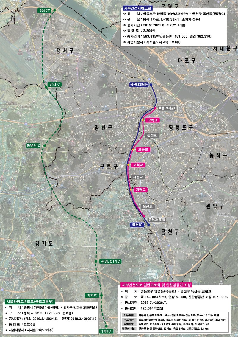 ‘서부간선도로 일반도로화 및 친환경공간 조성공사’는 서부간선 지하도로 및 광명-서울 고속도로와 연계해 서부간선 상부도로의 구조·기능을 개편하기 위한 사업이다. 단절된 안양천과의 접근성 개선을 통해 수변 친화도시를 조성하고, 일반도로화로 차로폭 축소, 녹지공간 확보 등 친환경 주민 편의공간을 조성하는 것이 목적이다.