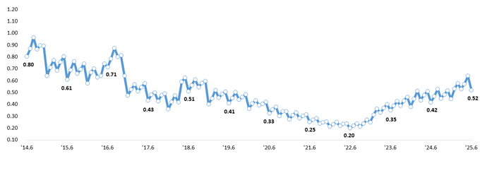 29일 금감원에 따르면 지난 6월말 기준 국내은행 원화대출 연체율은 0.52%로 집계됐다. 지난달 말(0.64%)보단 0.12%p 하락했으나, 해당 지표는 지난 2022년 6월말(0.20%) 이후 2023년 6월말(0.35%), 2024년 6월말(0.42%), 2025년 3월말(0.57%) 등으로 오름세를 보이고 있다.