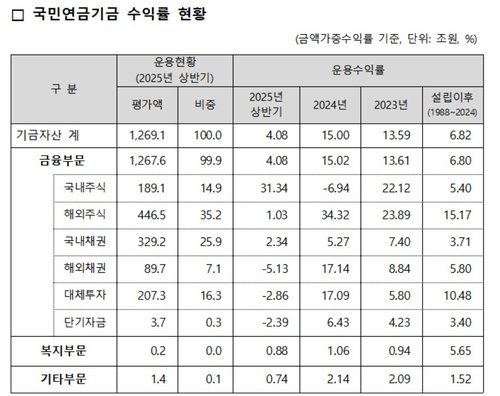 [파이낸셜뉴스] 국민연금이 올해 상반기 4%대의 안정적인 수익률을 기록하며 적립금 규모가 1269조원으로 늘어났다고 28일 발표했다.