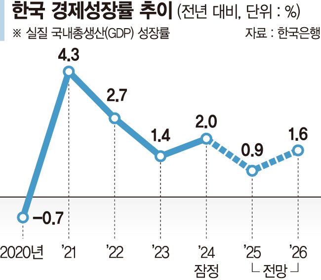 문제는 한은의 전망치 상향 조정에도 올해 경제성장률이 '경제위기' 수준인 0%대에 그쳤다는 점이다. 1960년대 이후 연간 성장률이 1.0%를 하회한 것은 △1998년 외환위기(-4.9%) △1980년 오일쇼크(-1.5%) △2020년 코로나19 팬데믹(-0.7%) △2009년 글로벌 금융위기(0.8%) 등과 같은 경제위기 때에 국한된다. 특히 건설경기 부진이 최대 걸림돌로 꼽힌다. 이 총재는 "건설경기가 부진한 점은 성장률을 0.3%p 낮추는 요인으로 작용했다"며 "건설투자 성장률이 -8.3%인데 이것을 '0'이라고 가정하면 올해 성장률 전망치는 2.1%였을 것"이라고 전했다.