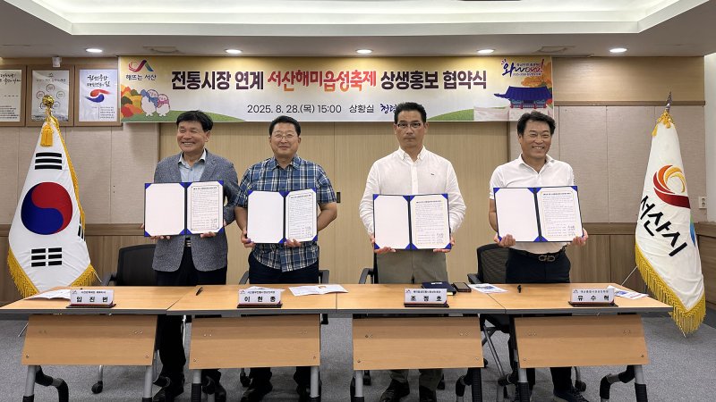 서산시는 지난 28일 시청 상황실에서 서산문화재단과 관내 3개 전통시장(서산동부전통시장, 해미읍성전통시장, 대산종합시장)이 ‘전통시장 연계 서산해미읍성축제 상생 홍보 협약’을 체결했다고 밝혔다.
