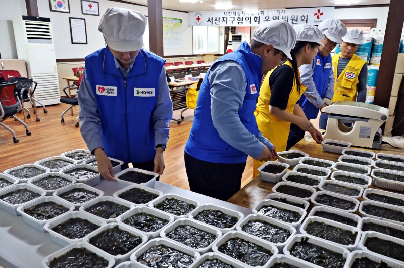 지난 2015년부터 대한적십자사봉사회 서산지구협의회와 함께 서산 '행복한끼' 사업소를 운영 중인 HD현대오일뱅크는 전날 임직원과 가족이 참여해 봉사자들이 만든 음식을 도시락에 담고 포장했다.