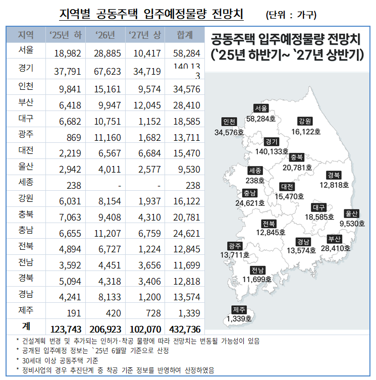 이에 따르면 전국의 공동주택 입주예정 물량은 올해 하반기엔 12만3743가구, 2026년 20만6923가구, 2027년 상반기 10만2070가구로 집계됐다. 2년간 총 43만2736가구다.