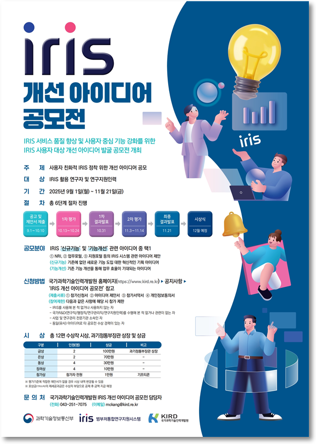 이번 공모전은 IRIS를 연구자 중심의 시스템으로 개선하기 위한 노력의 일환으로 추진된다. ‘연구자들이 IRIS를 직접 바꾼다!’는 슬로건 아래 IRIS를 실제로 활용 중이거나 참여 예정인 연구자와 연구지원인력을 대상으로 진행한다. 공모 분야는 기존에 없던 새로운 기능을 제안하는 ‘신규기능’ 부문과 기존 기능을 개선해 업무 효율을 높이는 ‘기능개선’ 부문으로 나뉘며, 참가자는 두 분야 중 하나를 선택해 응모할 수 있다. 접수는 9월 1일부터 10월 10일(금)까지 40여 일간 진행된다.