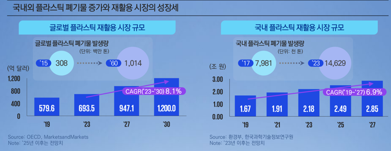 폐플라스틱 재활용 시장도 성장세를 보이고 있다. 글로벌 시장조사기관 마켓앤마켓에 따르면 전세계 플라스틱 재활용 시장규모는 2019년 580억 달러 규모를 이룬 가운데, 2030년 1200억달러 시장 규모에 도달할 것으로 전망된다.