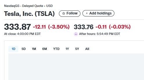테슬라는 3.50% 급락한 333.87달러를 기록했다. 이로써 시총도 1조770억달러로 줄었다.