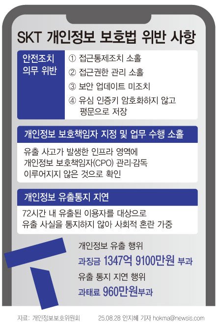 개인정보보호위원회는 지난 27일 전체회의에서 유심 해킹 사고 관련 안전조치 의무 위반, 유출 통지 지연 등을 이유로 SK텔레콤에 과징금 1347억9100만원과 과태료 960만원을 부과했다. 개인정보보호법 위반 과징금 중 역대 최대 규모다.