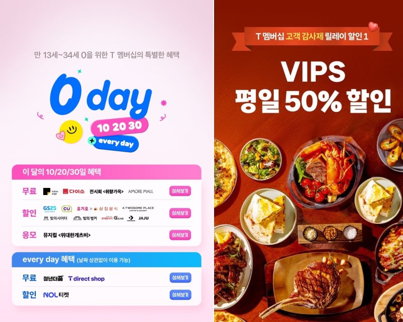9월 첫 고객 감사제 제휴사는 빕스다. 평일 방문 시 20만 원 한도 내 최대 10만 원까지 50% 할인을 받을 수 있다. 쿠폰은 9월 1일부터 10일까지 T멤버십 앱을 통해 받을 수 있다. 사용 기간은 10월 31일까지다.
