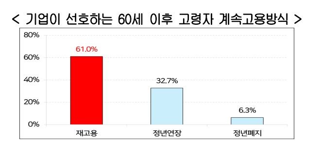 [파이낸셜뉴스] 국내 기업 60% 이상이 60세 이상 근로자의 고용방식으로 '재고용'을 가장 선호한 것으로 나타났다.