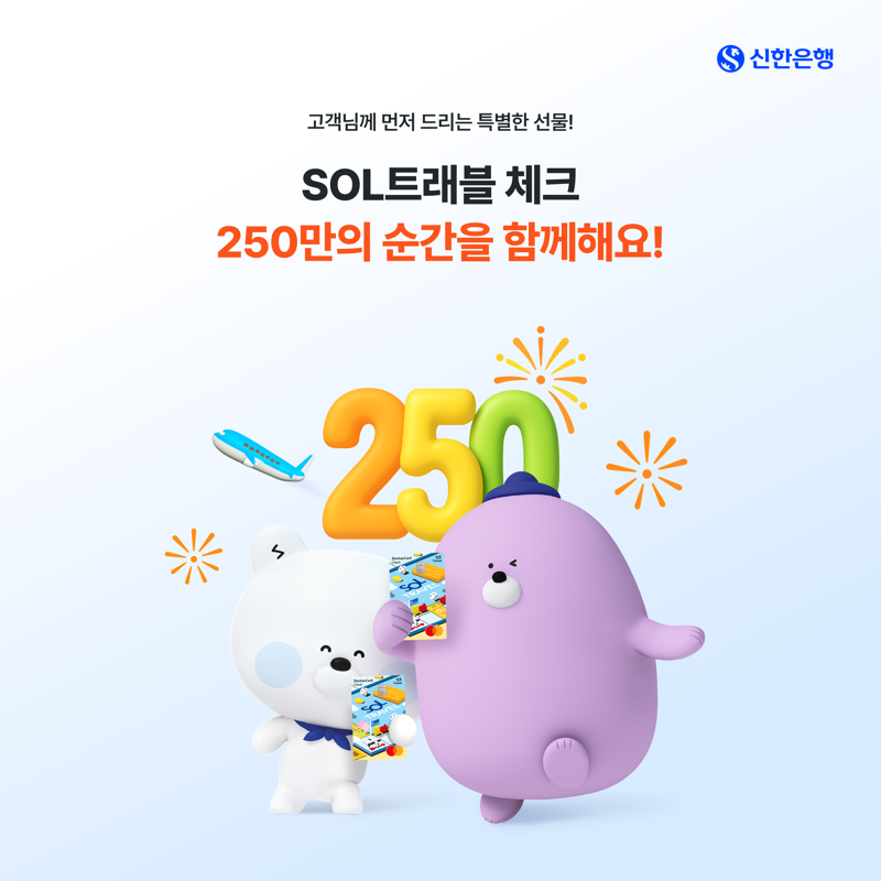 신한은행은 내달 1일부터 25일까지 ‘SOL트래블 체크 250만의 순간을 함께해요!’ 이벤트를 실시한다고 31일 밝혔다.